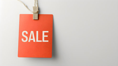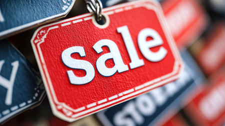 A vibrant red sale tag dangles prominently in the foreground, contrasting with a soft, blurred dark backdrop, enticing potential buyers. This visual hints at exciting shopping opportunities.