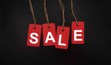 Tags with the word sales in red color, dark textured background, empty copy space