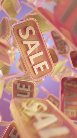 Bright Sale Signs Float In A Colorful Sky, Promoting Discounts And Shopping Deals