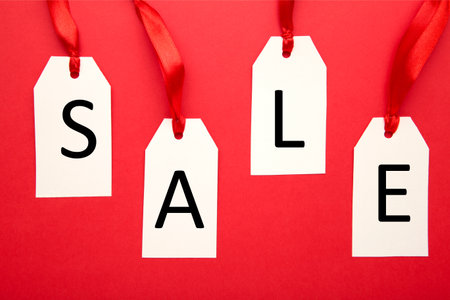 Close-up of red Sale tags stacking on table, modern labels for shops and stores