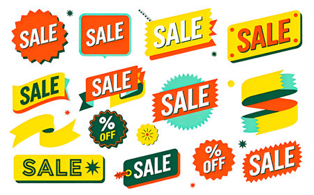 Bright and colorful sale tags arranged on a gradient background, ideal for promotional marketing, attracting consumers to discounts and offers.