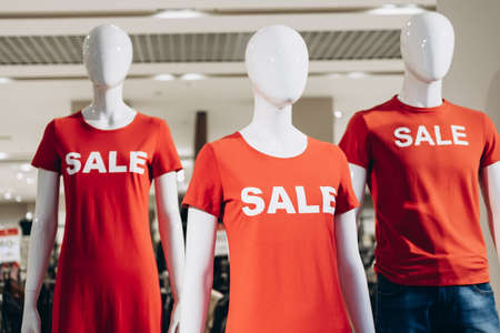 sale. Mannequins in red T-shirts in a shop window. Advertising