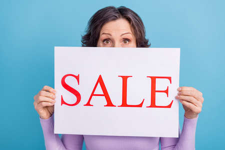 Photo of aged woman cover face paper poster news information sale isolated over blue color background