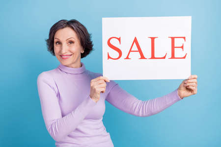 Photo of mature woman happy positive smile hold poster sale black friday isolated over blue color background