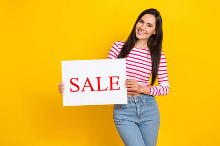 Portrait of young attractive cute smiling woman hold placard sale shopping clothes low price isolated on yellow color background