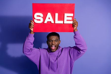 Young man enthusiastically holding sale sign above his head against purple background showing excitement and energy