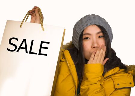 young beautiful and happy Asian Korean woman in cool winter hat holding shopping bag excited buying Christmas present smiling cheerful in fashion and beauty concept isolated on studio background