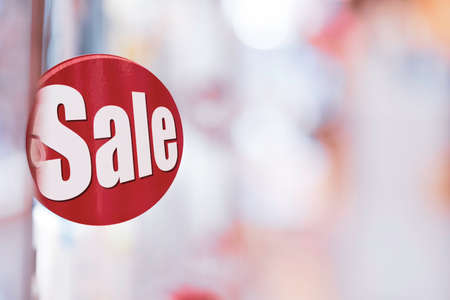 Sale in a clothing store. Red sign saying Sale inside the store, blurred background. Product discount, black friday concept
