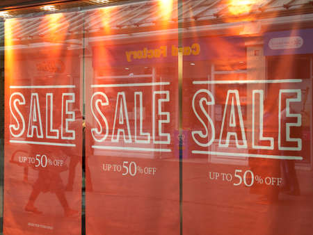 Sale at a clothing store. Red posters with the word Sale at the entrance to the mall.