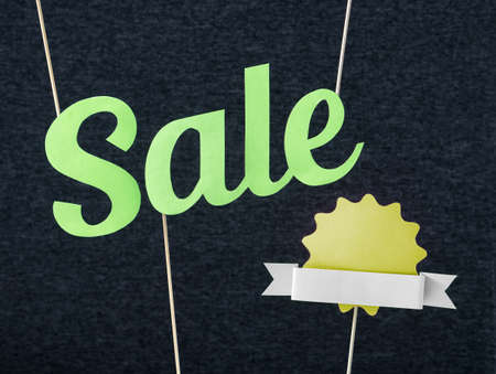 Fun summer sale design for promo. Hanging green letters and yellow badge with ribbon cut from cardboard paper on wooden stick. Fresh and fun marketing look. Free blank empty copy space for text.