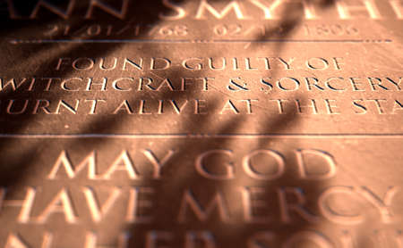 A 3D render of closeup of a carved and etched tombstone of a suspected witch burnt at the stake