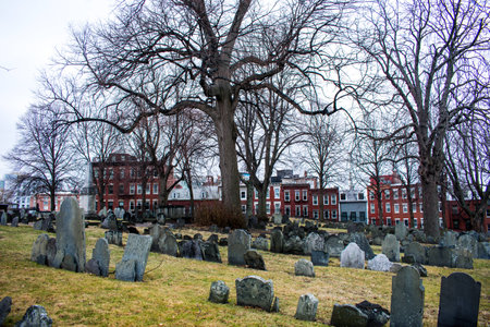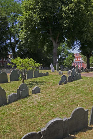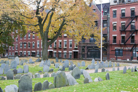 A grave yard on Bosotn the freedom trail, backed by red brick buildings