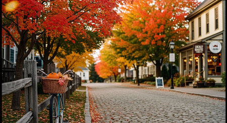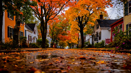 A picturesque autumn scene with a tree-lined street colorful leaves and houses