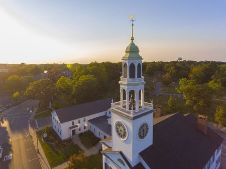 Old South United Methodist Church aerial view at sunset in historic town center, Reading, Massachusetts, MA, USA.