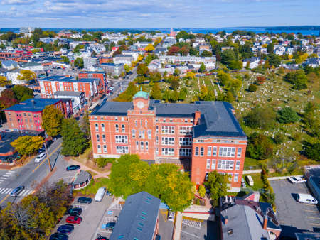 Aerial view of North School building and Eastern Cemetery on 248 Congress Street in downtown Portland, Maine ME, USA.
