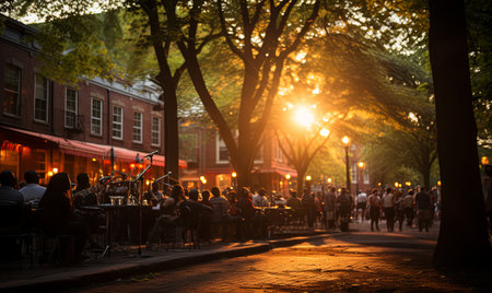 Group of people walking down a city street while the sun sets in the background, creating a warm glow.