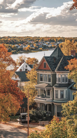 In a picturesque historic town, vibrant autumn leaves surround a beautifully restored house overlooking a peaceful river, reflecting the season's charm.