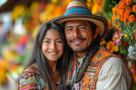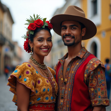 Hispanic Heritage Month. lovely hispanic couple in traditional clothes, man and woman looking at each other against Festive Backdrop in city