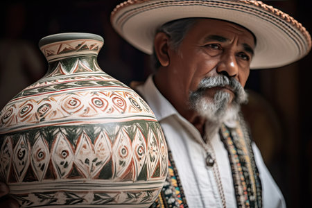 a man wearing a soi hat and holding a large ceramic vase in front of his face, cusco, peru. Generative Ai