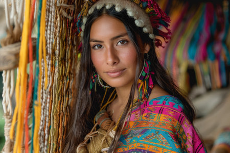 An Indigenous woman weaves traditional textiles, honoring craftsmanship, cultural heritage, under natural light.