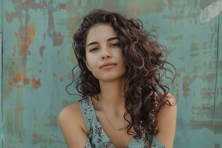 A woman in a green floral dress is smiling and posing for a picture. Concept of happiness and positivity