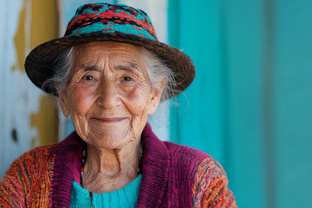 A kind elderly woman, showing deep wrinkles and warmth, wears a colorful hat and vibrant sweater. She stands against a striking turquoise wall that adds life to the setting.