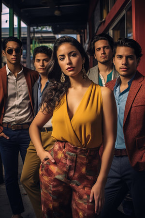 Hispanic Heritage Month . a group of mexican men and women posing for the camera, wearing traditional in orange color with black background, all looking at front camera