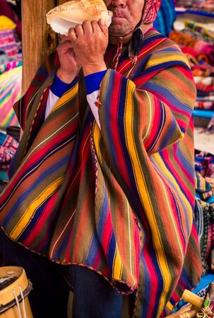 RAQCHI PERU -JANUARY 15: Quechua woman sells handcrafts at a market in Raqchi, Peru on January 15, 2013. Raqchi Ruins is a popular destination for tourism from all around the world.