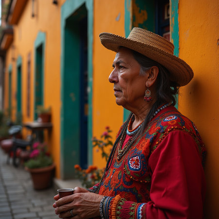 Unidentified Mexican woman in traditional clothes with a cup of coffee in the street.