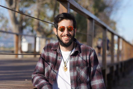 A closeup shot of a handsome smiling Caucasian male in sunglasses posing for the camera