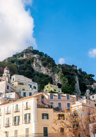 Amalfi cityscape on coast line of mediterranean sea, traveling in Italy