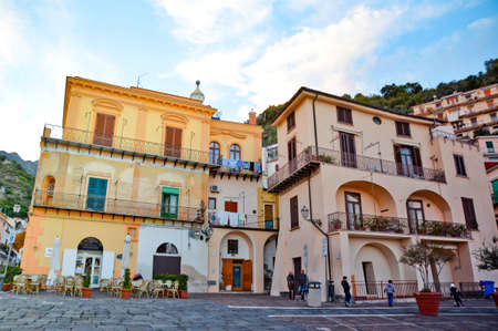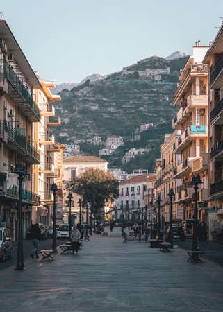 Pedestrian plaza with buildings and mountains, in Maiori, Campania, Italy