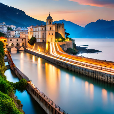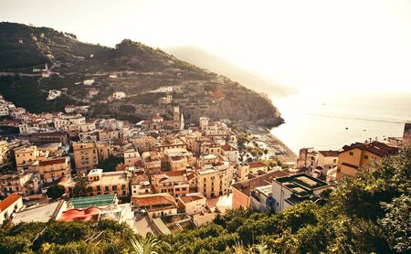 Scenic view during sunset on the harbor at the coastal village of Amalfi at Mediterranean Sea in Campania, Italy, Europe. Warm sunlight is touching the waterfront houses. Golden hour at Amalfi Coast