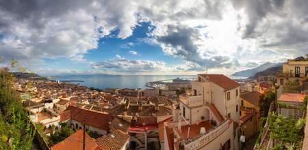 Aerial view to Vietri sul Mare and Salerno city and mountains, Italy. Shot from above to the sea and landscape. Big and small ships near town and city. Panorama of the rocks and houses.