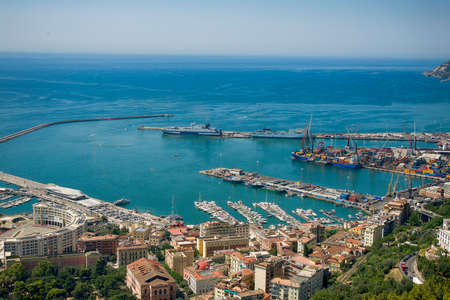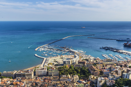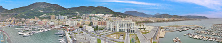 Drone panorama over the harbor of the Italian city of Salerno on the Amalfi Coast during the day