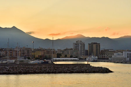 The port of Termini Imerese with the lights of the sunset on the Massif of Termini