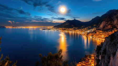 The night panorama of Italian city Salerno. The moon rising from behind the mountains over.
