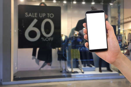 human hand hold blank screen smart phone, tablet, cellphone on Discount label at cloth store background. concept of online shopping.