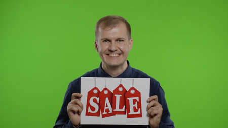 Great discounts. Happy cheerful blonde man in blue shirt showing Sale word advertisement inscription. Shopping with low prices, Black Friday concept. Chroma key background