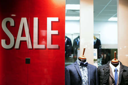 Sale label sign in front of shop, against the background of a clothing store. The concept of seasonal sales and discounts