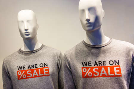 Mannequins in T-shirts with the inscription sale. Black and white