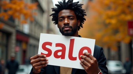 Man holding a sign that says SALE. He is standing on a street. There are cars and a truck in the background