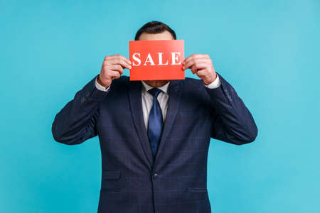 Unbelievable shopping discount! Portrait of unknown man in elegant suit covering eyes with Sale inscription, market discounts, black friday. Indoor studio shot isolated on blue background.