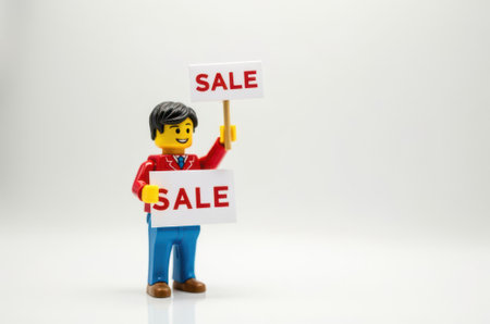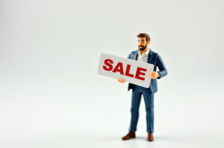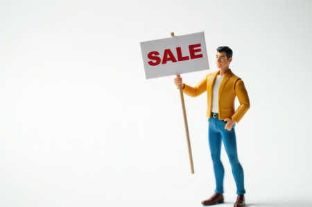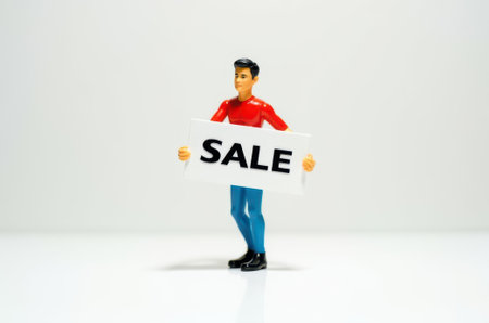 toy man holding a sign with the text Sale on a white background