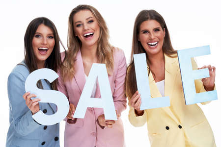 Three women in pastel suits holding sale letters over white background