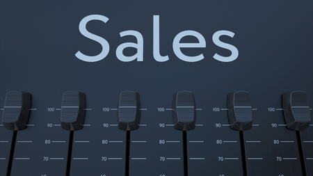 Multiple sliding faders on a panel with sales inscription. Conceptual 3D rendering