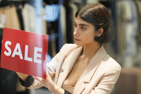Portrait of beautiful woman hanging red SALE sign on window display in clothes store, copy space