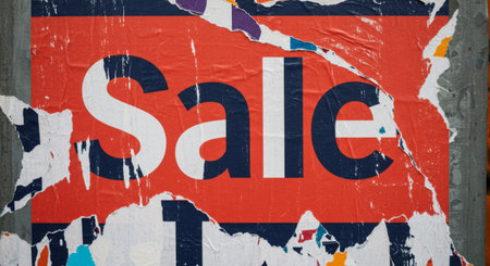 Close-up of a distressed red poster with the word Sale in torn, peeling paper layers on an urban wall. Grunge street advertising texture background.