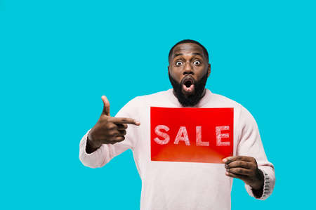 Surprised african american man emotionally looking at the camera and pointing his finger at a red sale sign, on a blue isolated background