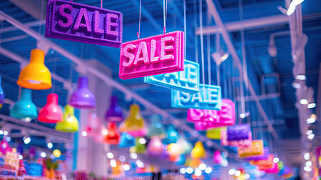 Bright and colorful sale signs dangle from the ceiling in a modern retail store, creating a vibrant shopping atmosphere filled with excitement.